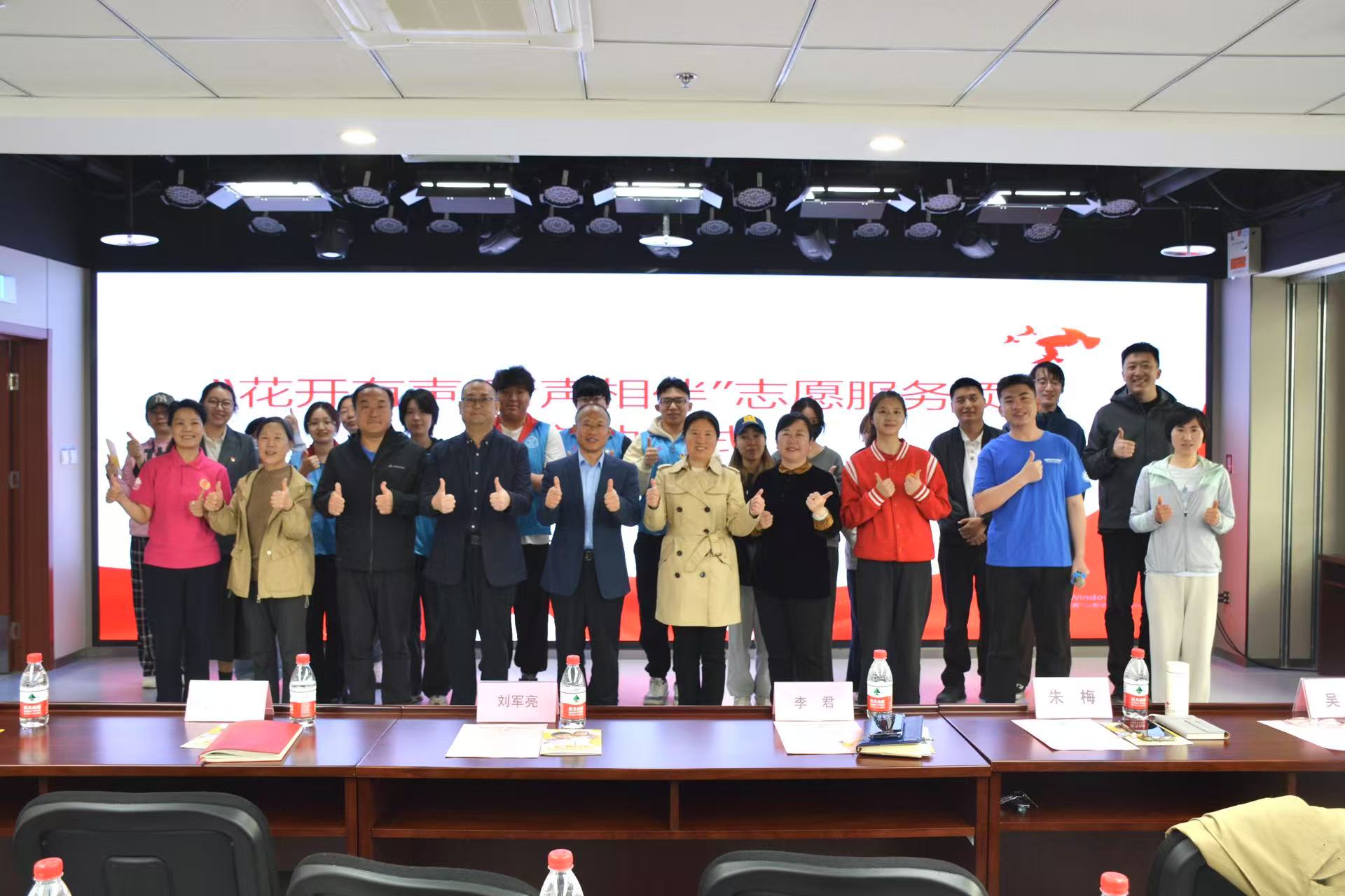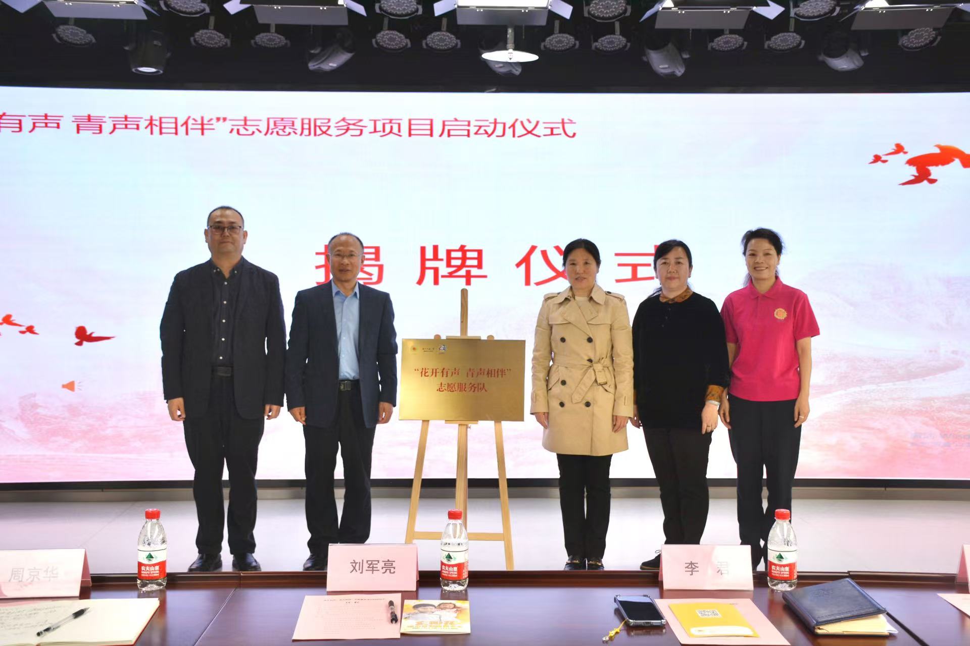 在全体见证下,李君、刘军亮、周京华、朱梅共同为志愿服务队揭牌,携手开启青年学生志愿者关爱听障群体的温暖旅程。