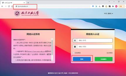 (2)连接NCUT访问外网时会默认弹出认证页面,在认证页面输入账号(学号或工号)和密码点击登录即可。若无法弹出认证页面,在浏览器地址栏输入ip.zqplatform.com即可打开。