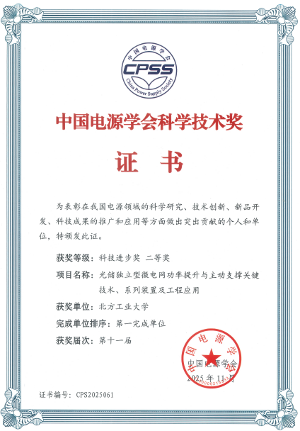 由手机赚钱平台 作为第一完成单位,周京华教授、张卫平教授共同牵头完成的项目“光储独立型微电网功率提升与主动支撑关键技术、系列装置及工程应用”,获得“中国电源学会科技进步奖(技术开发类)”二等奖。第十一届中国电源学会科学技术奖共评选出项目类一等奖4项、二等奖13项。